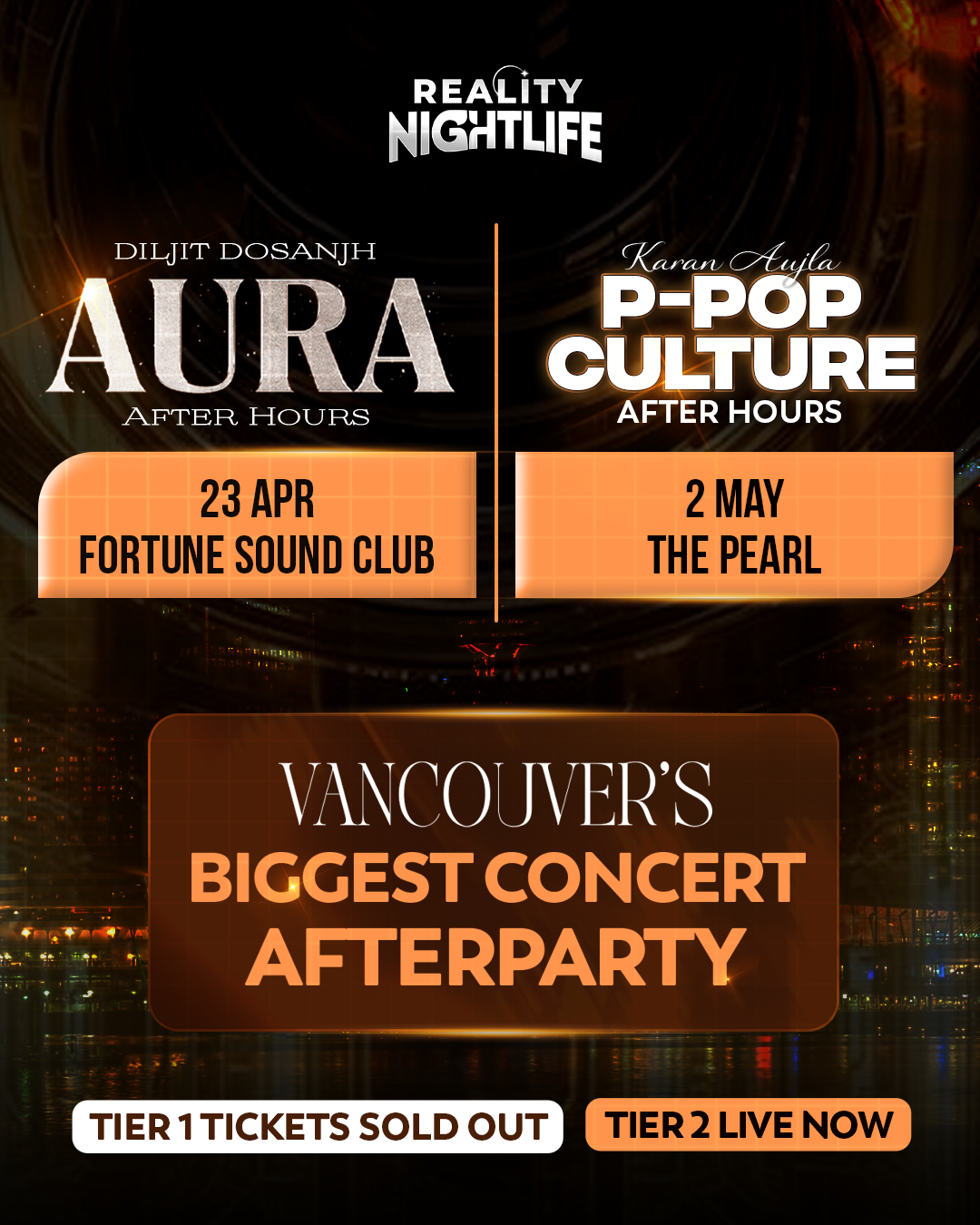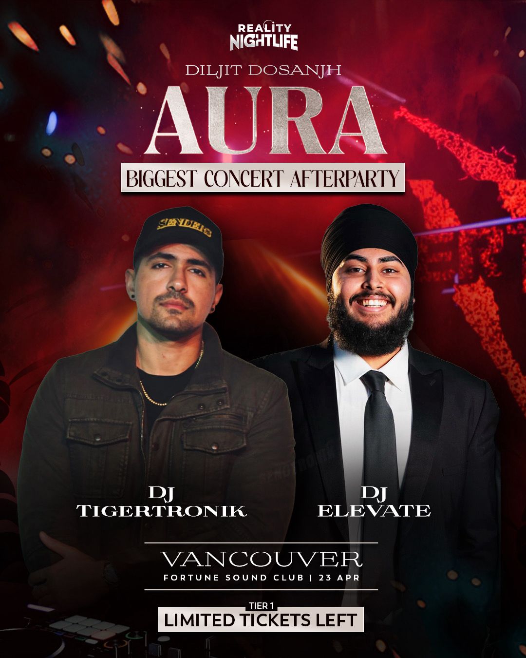 Keep the energy going after the concert at the Diljit Dosanjh Concert Afterparty 2026, presented by Reality Nightlife in Vancouver. Following the AURA concert, this high-energy afterparty transforms Fortune Sound Club into a premium nightlife experience with immersive visuals, powerful sound, and an electrifying atmosphere.