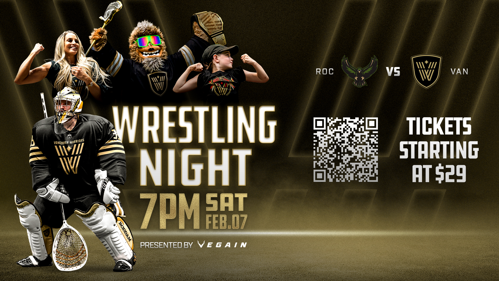 The Vancouver Warriors take on the Rochester Knighthawks in battle during Wrestling Night, presented by VEGAIN, on Saturday, February 7 at 7:00pm. Grab your crew and get set for a night of jam-packed, lacrosse action!