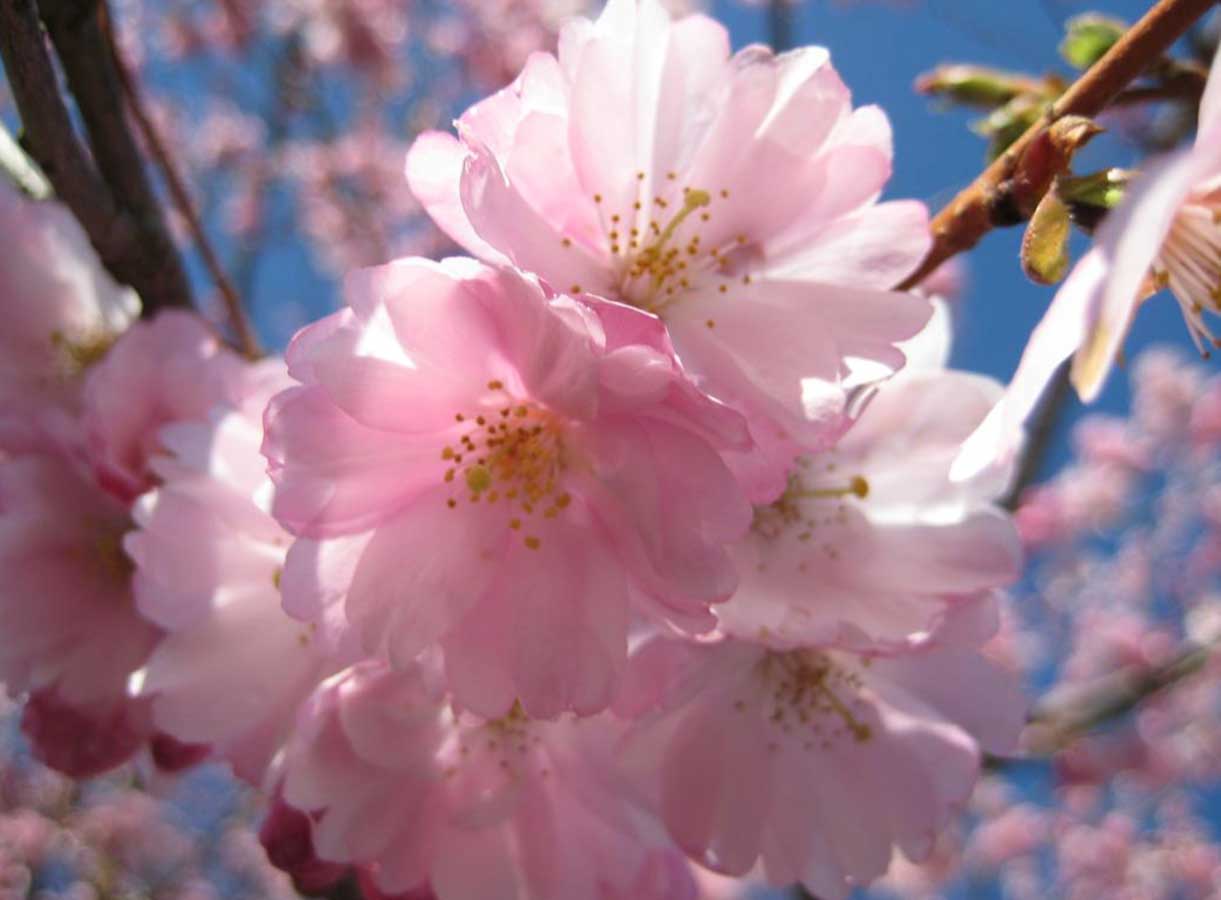 A graceful, umbrella-shaped tree with soft, semi-double light pink flowers. Blooming as early as late February, Accoladeis one of the first cherries to appear and adds an elegant touch to parks and streets. It’s a hybrid with delicate petals that glow slightly in sunlight.