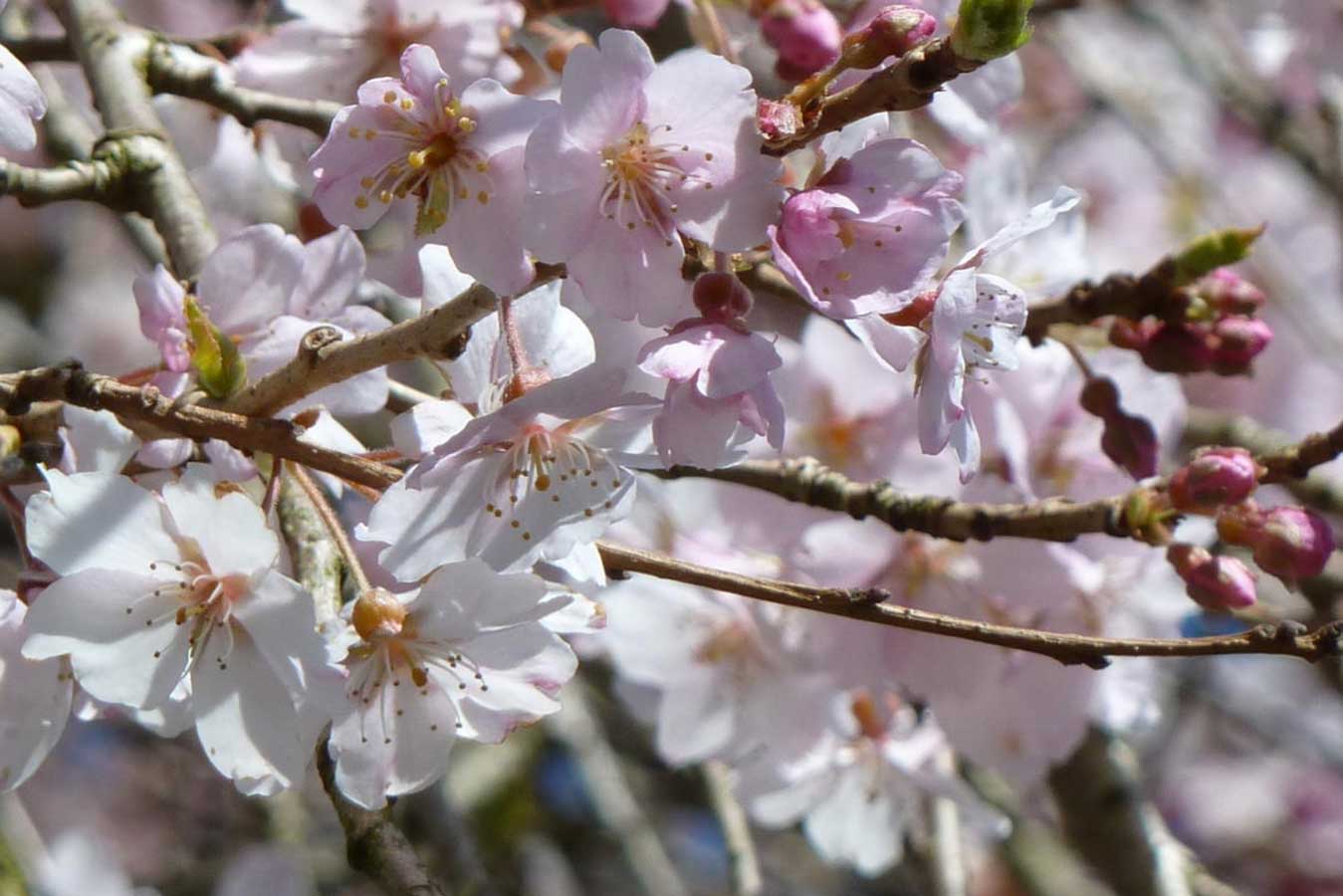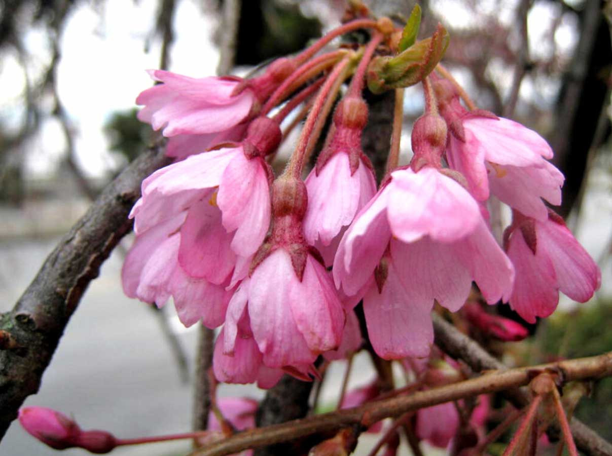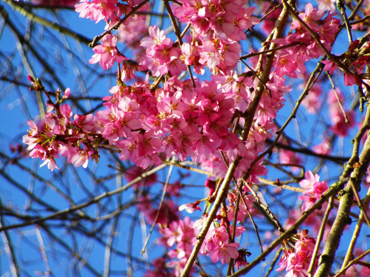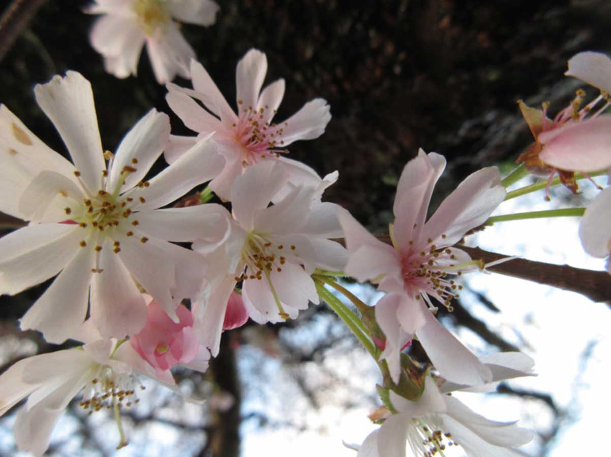 These unique trees can bloom intermittently from autumn through early spring. Their pale pink blossoms appear in waves, making them a rare and surprising sight during colder months.