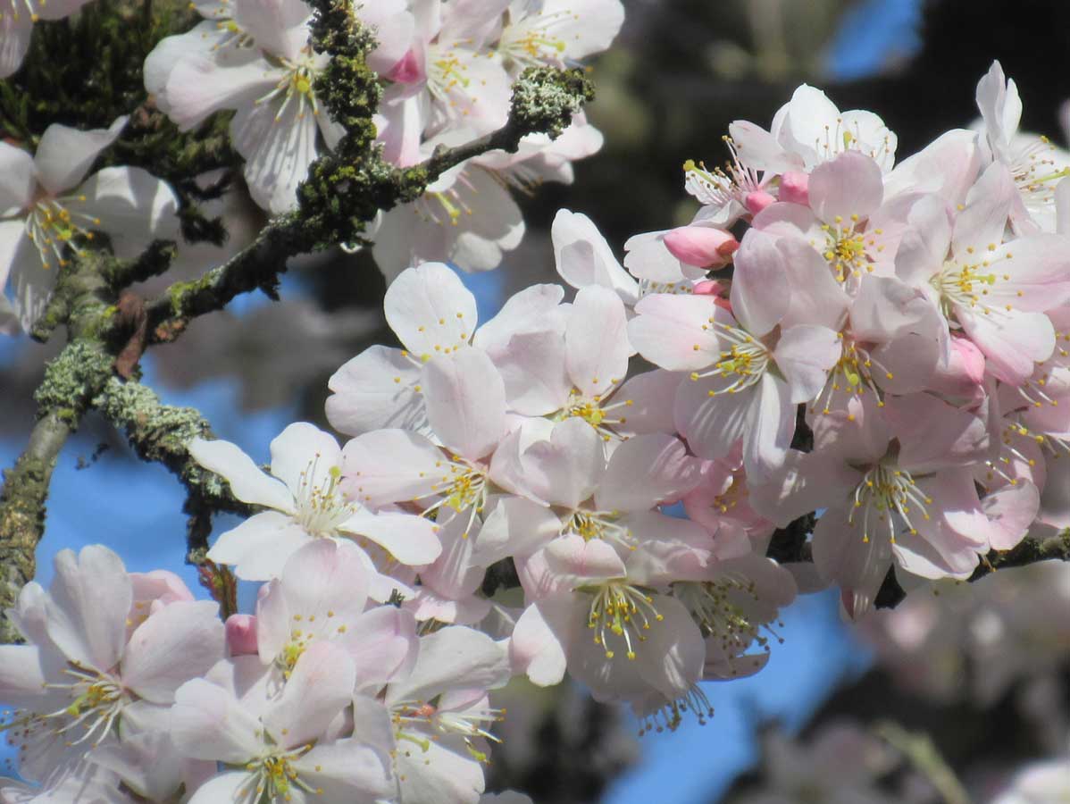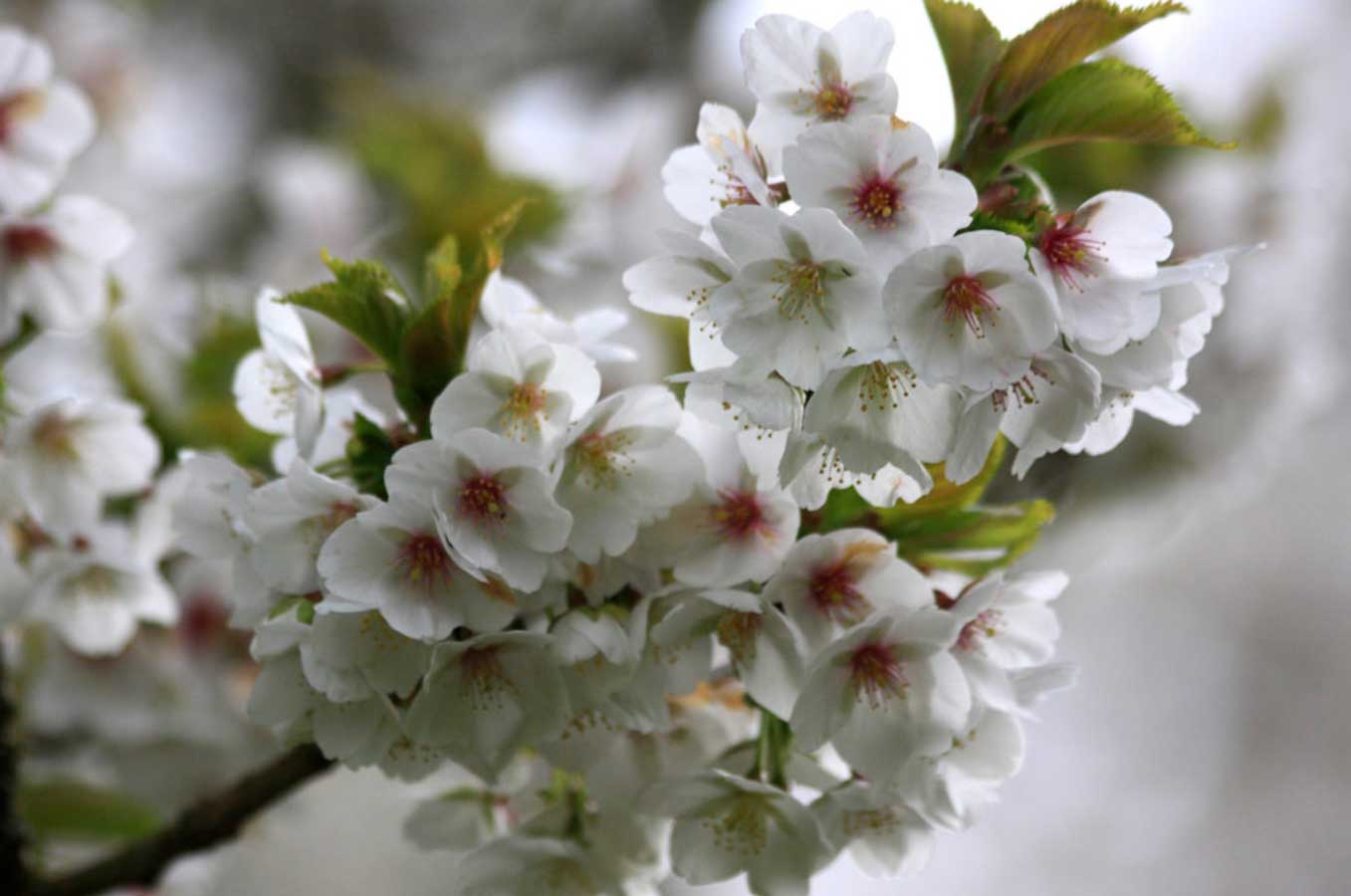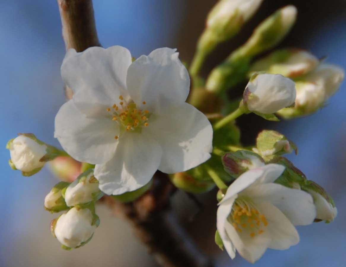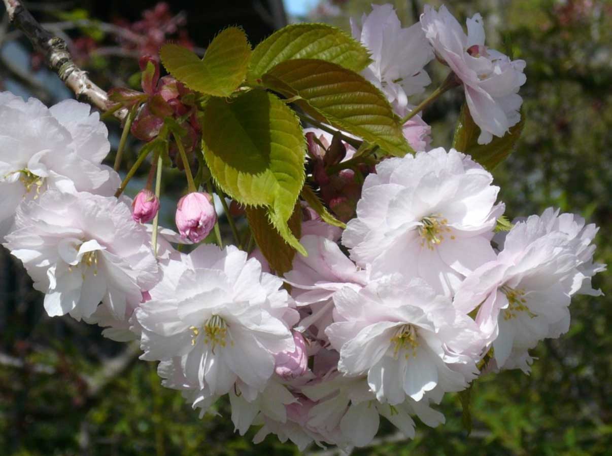 A late bloomer with large, layered white flowers tinged with pink. Its blossoms are among the largest of all cherries, giving it a soft, luxurious appearance.